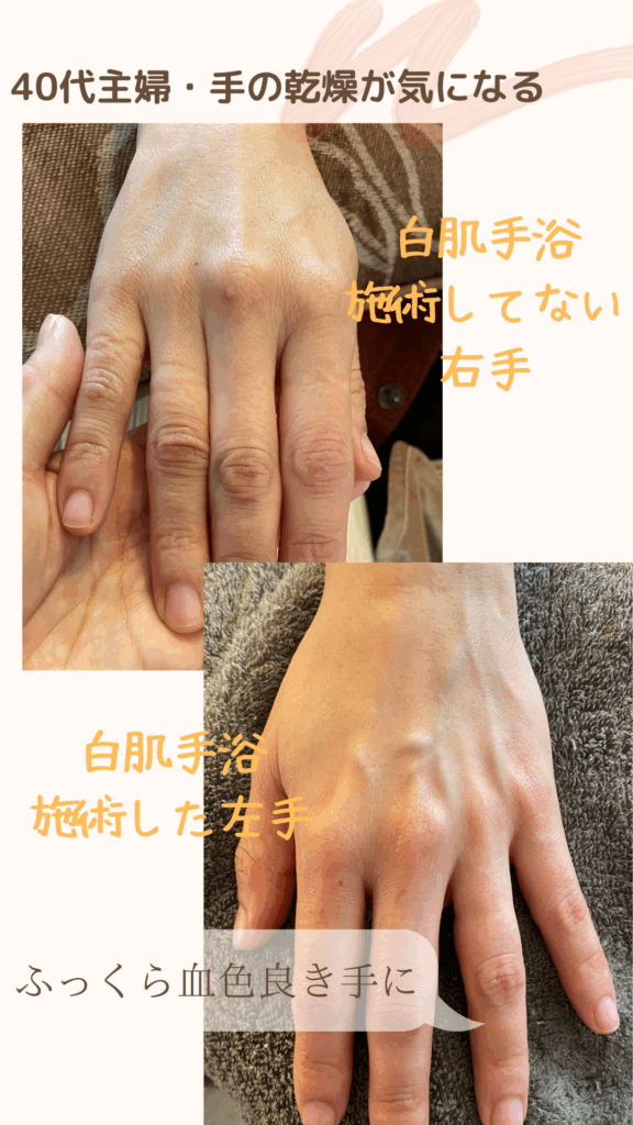 顏にも使える全身用しっとりタイプのオイルインローション。こちらを手に使い続けた7か月後のお客様の手の写真で伝わる保湿力!乾燥ってどれだけ皮膚を老化させるか一目瞭然ですよね。